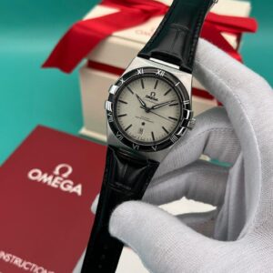 ساعت مچی امگا کانسلیشن بند چرم مردانه صفحه صدفی دور مشکی